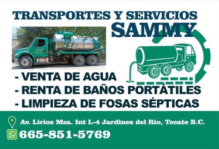 En Transportes y Servicios Sammy estamos listos para atender tus necesidades de pipas en Tecate, venta de agua potable, desagüe de fosas sépticas o renta de sanitarios portátiles. Nuestro compromiso es ofrecer atención inmediata, soluciones eficientes y precios justos.